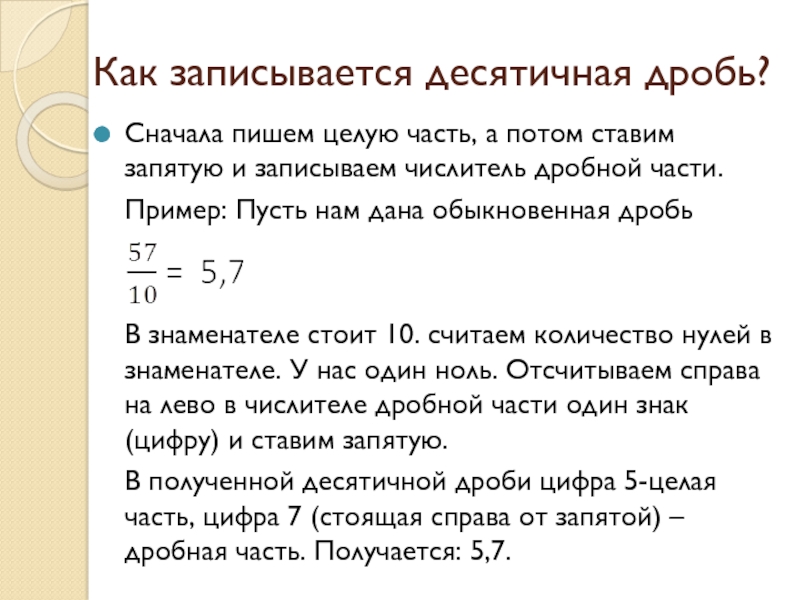 В полученной десятичной дроби цифра 5-целая часть, цифра 7 (стоящая справа от запятой) – дробная часть. Получается: 5,7.