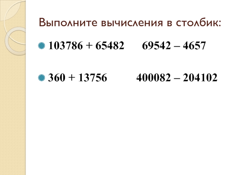 Выполните вычисления в столбик: 103786 + 65482   69542 – 4657 360 + 13756