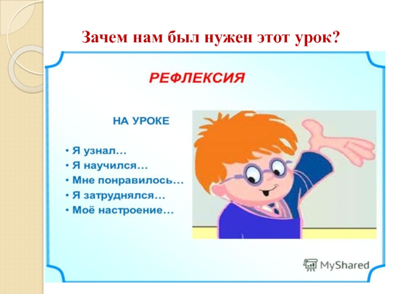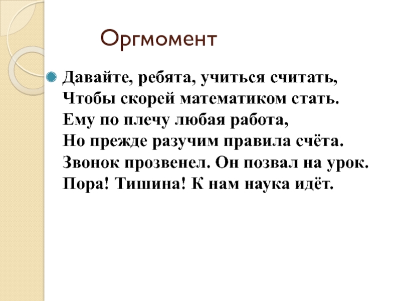 ОргмоментДавайте, ребята, учиться считать, Чтобы скорей математиком стать. Ему по плечу любая работа, Но прежде разучим правила счёта. Звонок прозвенел. Он позвал на урок. Пора! Тишина! К нам наука идёт.