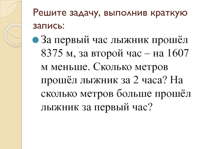 Решите задачу, выполнив краткую запись: За первый час лыжник прошёл 8375 м, за второй час –