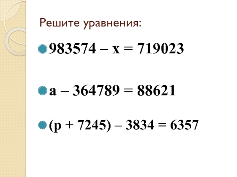 Решите уравнения: 983574 – x = 719023a – 364789 = 88621(p + 7245) – 3834 =