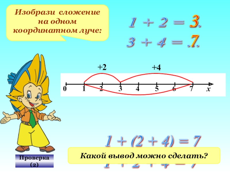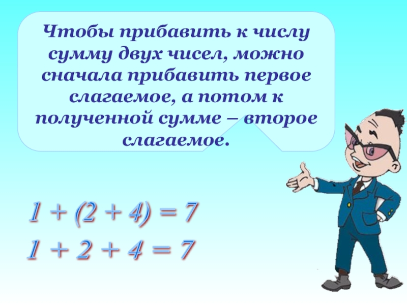 Чтобы прибавить к числу сумму двух чисел, можно сначала прибавить первое слагаемое, а потом к полученной сумме – второе слагаемое.