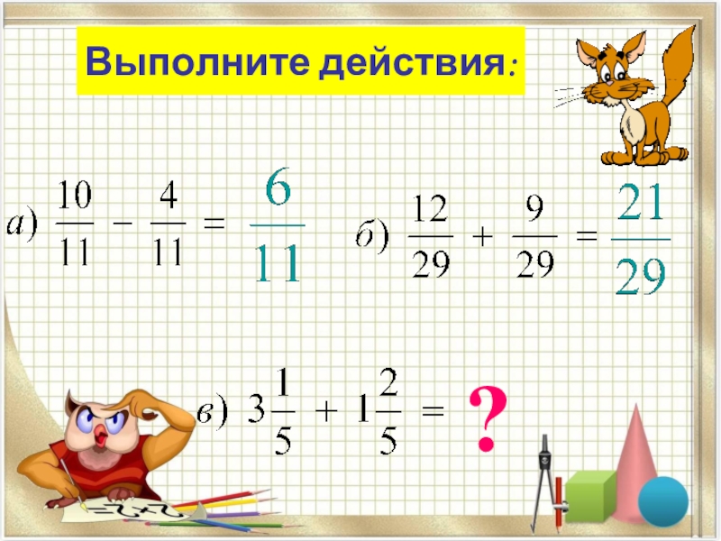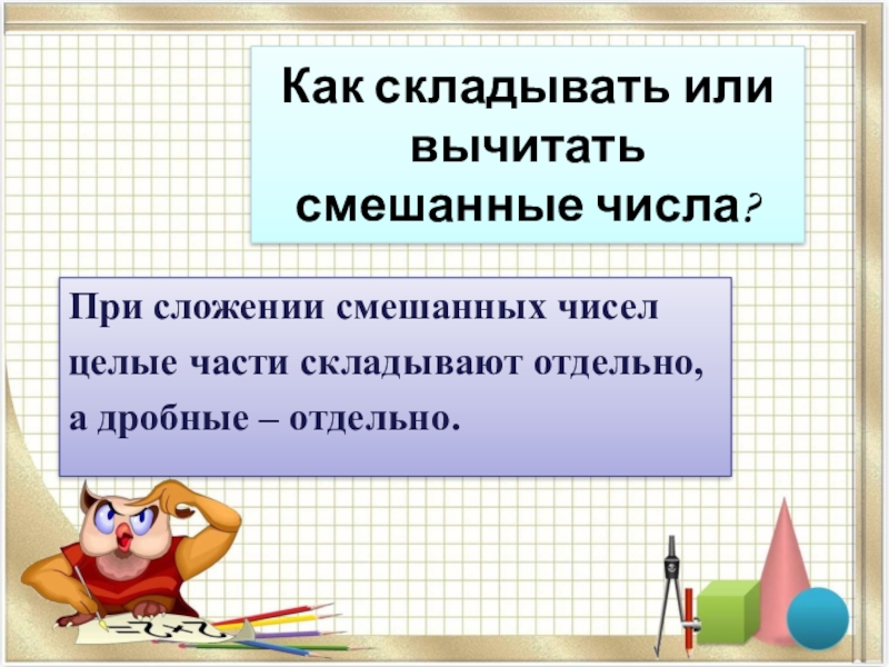 Презентация, доклад по математике на тему: Сложение и вычитание смешанных чисел урок 1