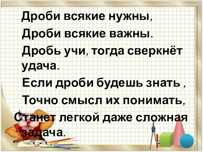Дроби всякие нужны,  Дроби всякие важны.  Дробь учи, тогда сверкнёт удача.  Если