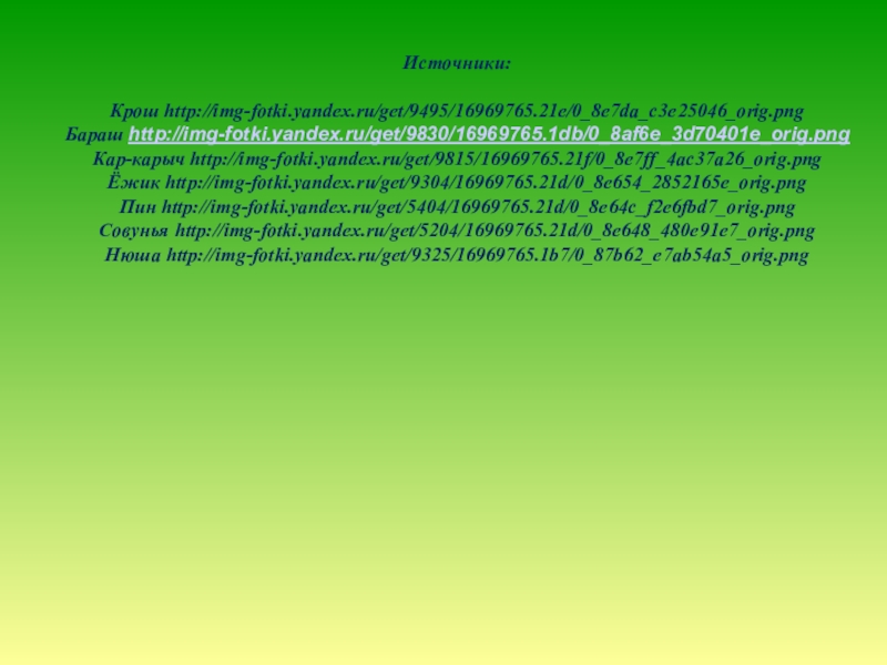 Источники:Крош http://img-fotki.yandex.ru/get/9495/16969765.21e/0_8e7da_c3e25046_orig.pngБараш http://img-fotki.yandex.ru/get/9830/16969765.1db/0_8af6e_3d70401e_orig.pngКар-карыч http://img-fotki.yandex.ru/get/9815/16969765.21f/0_8e7ff_4ac37a26_orig.pngЁжик http://img-fotki.yandex.ru/get/9304/16969765.21d/0_8e654_2852165e_orig.pngПин http://img-fotki.yandex.ru/get/5404/16969765.21d/0_8e64c_f2e6fbd7_orig.pngСовунья http://img-fotki.yandex.ru/get/5204/16969765.21d/0_8e648_480e91e7_orig.pngНюша http://img-fotki.yandex.ru/get/9325/16969765.1b7/0_87b62_e7ab54a5_orig.png