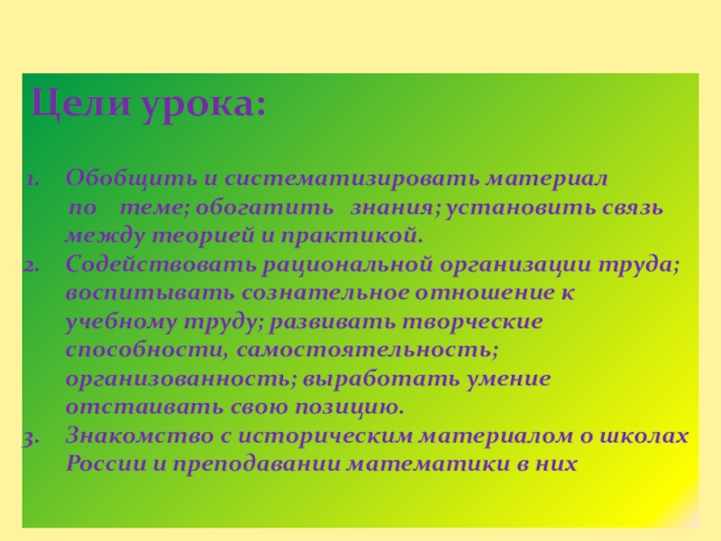 Содействовать рациональной организации труда; воспитывать сознательное отношение к учебному труду; развивать творческие способности, самостоятельность; организованность; выработать умение отстаивать свою позицию.