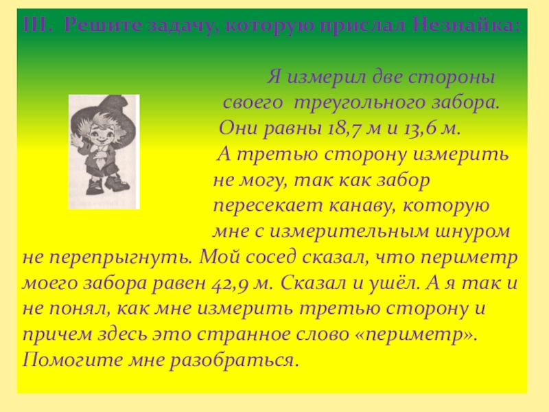 Слайд 6III. Решите задачу, которую прислал Незнайка: