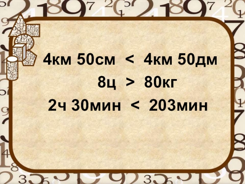 4км 50см < 4км 50дм   8ц > 80кг 2ч 30мин < 203мин