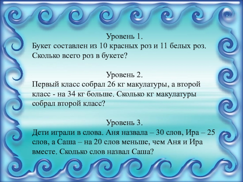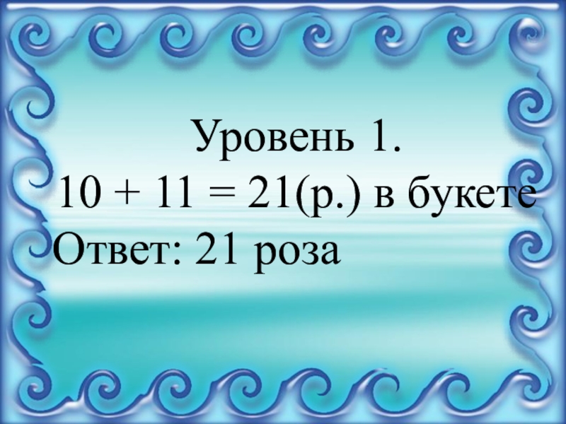 Уровень 1.Букет составлен из 10 красных роз и 11 белых роз. Сколько всего роз в букете? Уровень 2.Первый