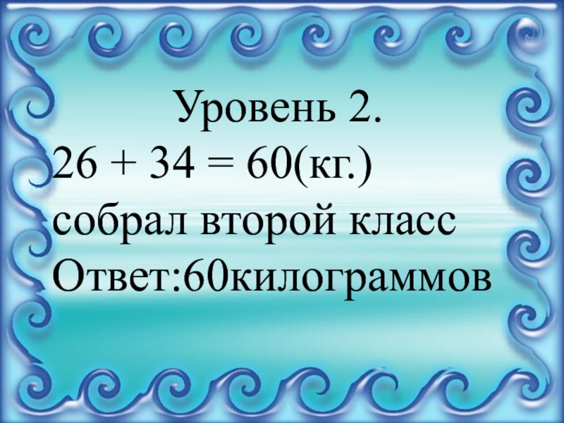 Уровень 2.26 + 34 = 60(кг.) собрал второй классОтвет:60килограммов