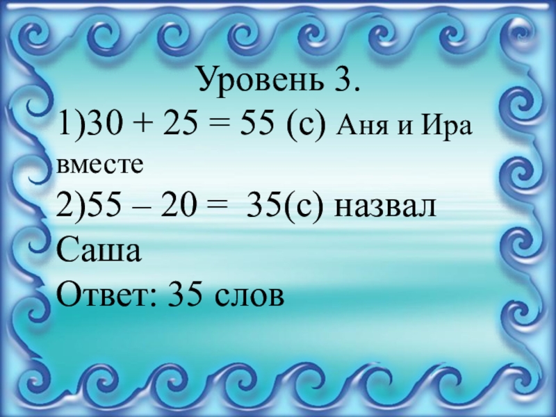 Уровень 3.1)30 + 25 = 55 (с) Аня и Ира вместе2)55 – 20 = 35(с) назвал СашаОтвет: