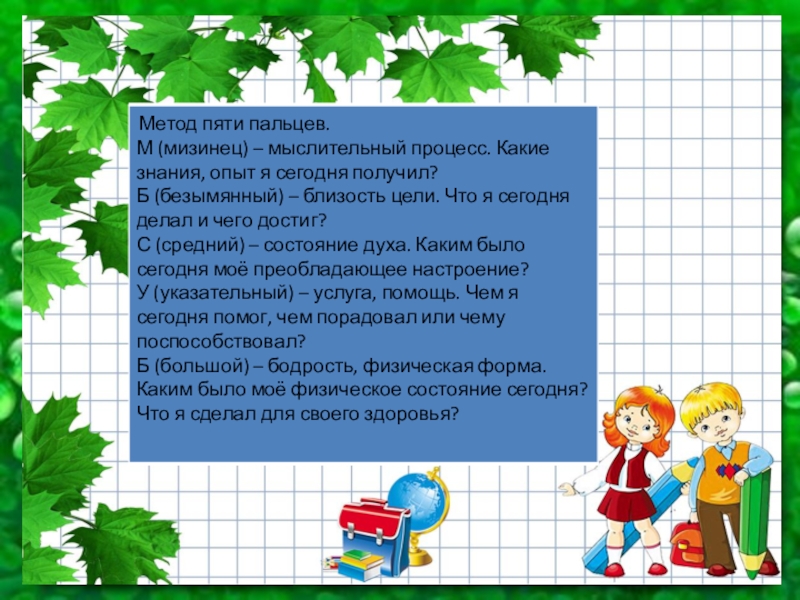 М (мизинец) – мыслительный процесс. Какие знания, опыт я сегодня получил?