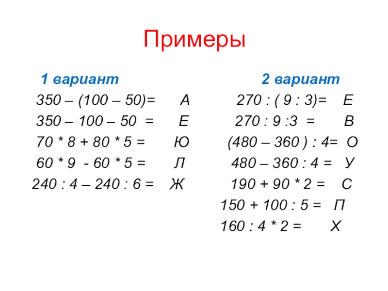 350 – 100 – 50 = Е 270 : 9 :3 = В