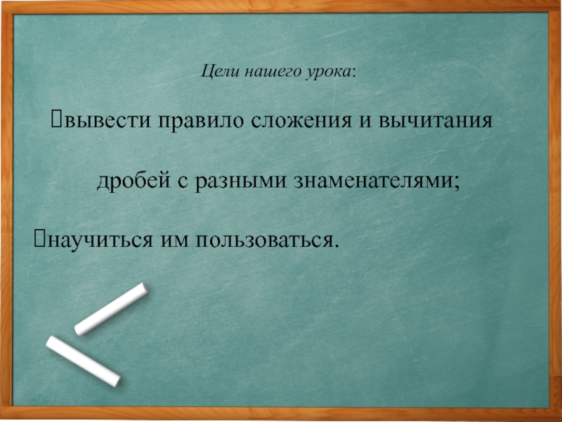 Цели нашего урока: вывести правило сложения и вычитания дробей с разными знаменателями; научиться им пользоваться.