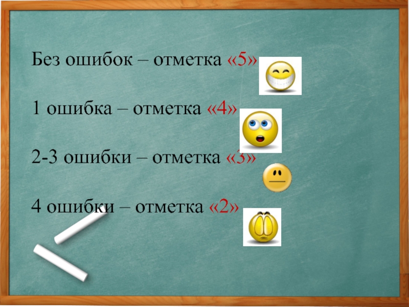 Без ошибок – отметка «5»1 ошибка – отметка «4»2-3 ошибки – отметка «3»4 ошибки – отметка «2»