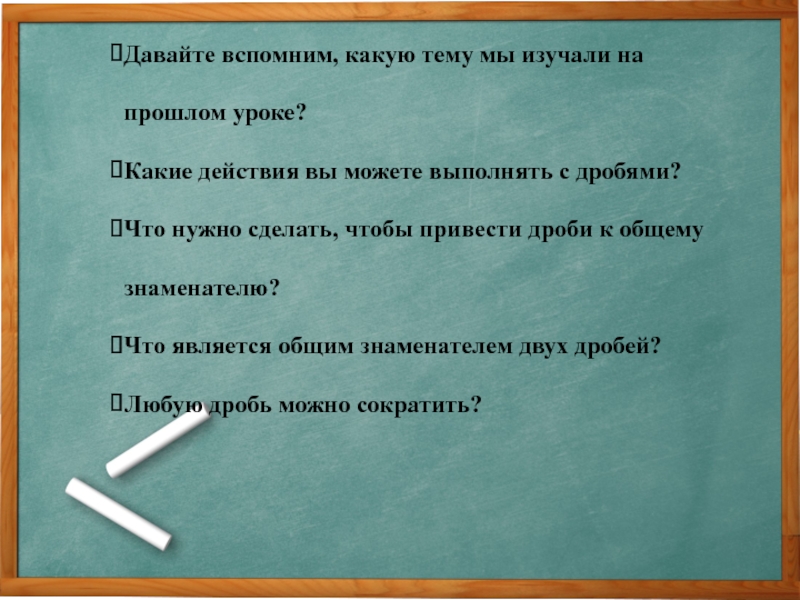 Давайте вспомним, какую тему мы изучали на прошлом уроке?Какие действия вы можете выполнять с дробями?Что нужно сделать, чтобы привести дроби к общему знаменателю?Что является общим знаменателем двух дробей?Любую дробь можно сократить?