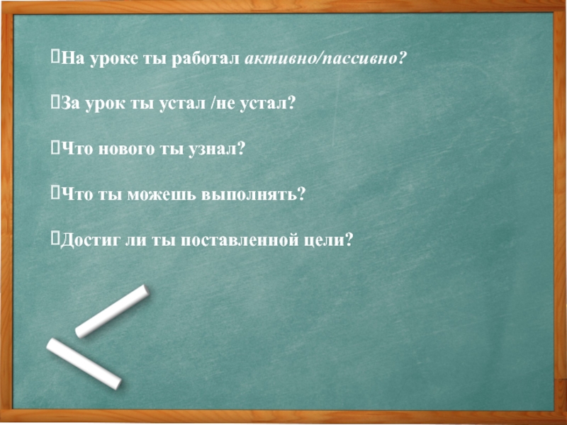 На уроке ты работал активно/пассивно?За урок ты устал /не устал?Что нового ты узнал?Что ты можешь выполнять?Достиг