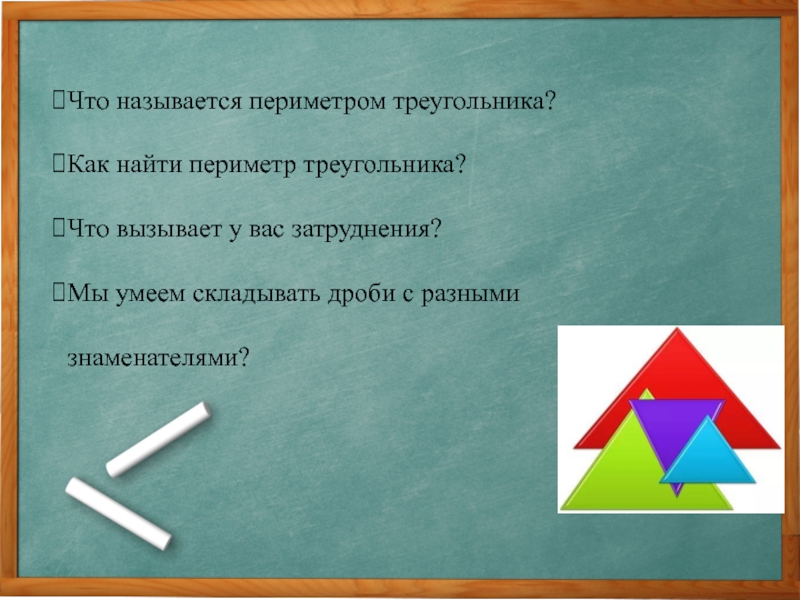 Что называется периметром треугольника?Как найти периметр треугольника?Что вызывает у вас затруднения?Мы умеем складывать дроби с разными