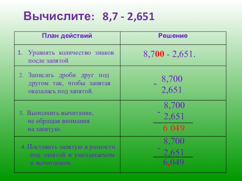 4. Поставить запятую в разности под запятой в уменьшаемом и вычитаемом