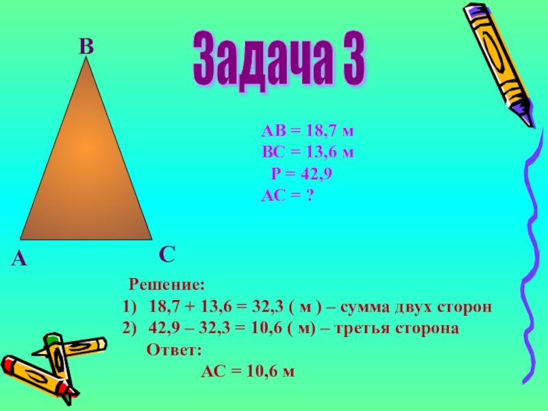 42,9 – 32,3 = 10,6 ( м) – третья сторона