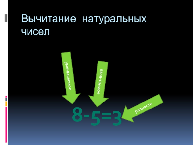 Вычитание натуральных чисел8-5=3уменьшаемоевычитаемоеразность