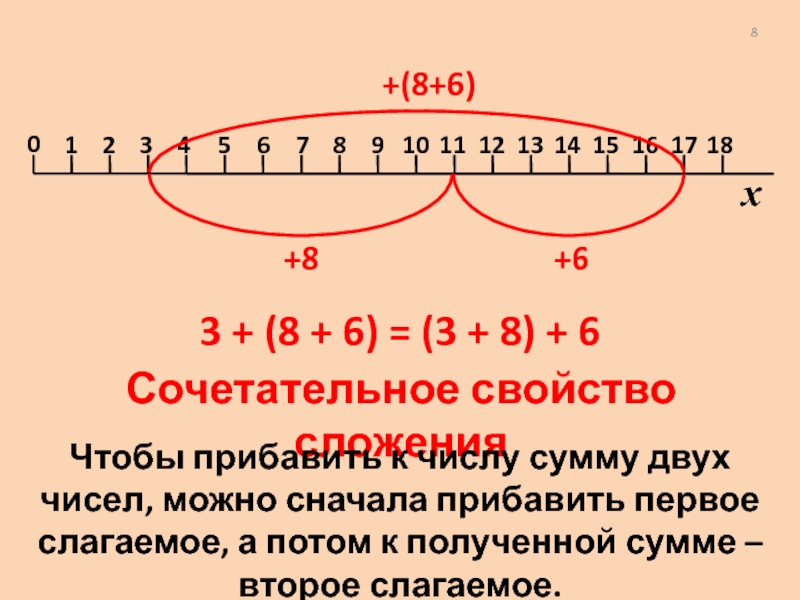 Чтобы прибавить к числу сумму двух чисел, можно сначала прибавить первое слагаемое, а потом к полученной сумме – второе слагаемое.