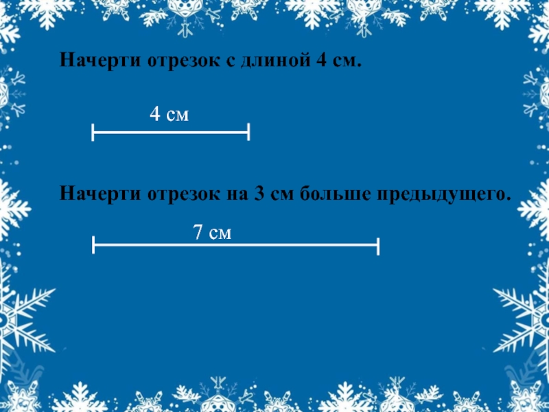 Начерти отрезок с длиной 4 см.4 смНачерти отрезок на 3 см больше предыдущего.7 см