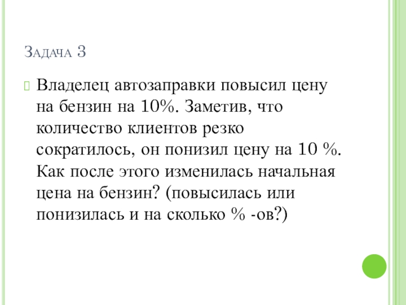 количество клиентов резко сократилось, он понизил цену на 10 %. Как после этого изменилась начальная цена на бензин? (повысилась или понизилась и на сколько % -ов?)