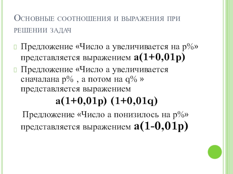 Предложение «Число а увеличивается сначалана р% , а потом на q% » представляется выражением