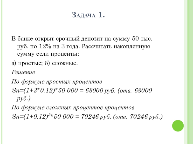 Sn=(1+0.12)3*50 000 = 70246 руб. (отв. 70246 руб.)