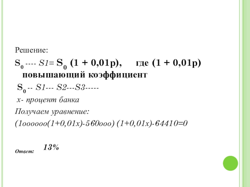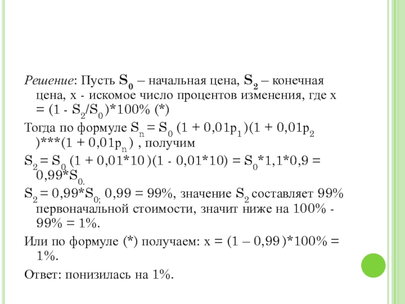Слайд 11Решение: Пусть S0 – начальная цена, S2 – конечная цена, х