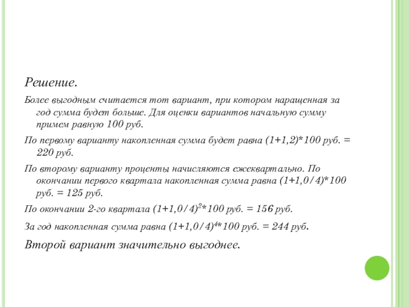 Более выгодным считается тот вариант, при котором наращенная за год сумма
