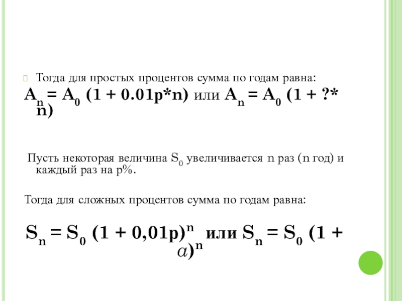 Sn = S0 (1 + 0,01р)n или Sn = S0 (1 + a)n