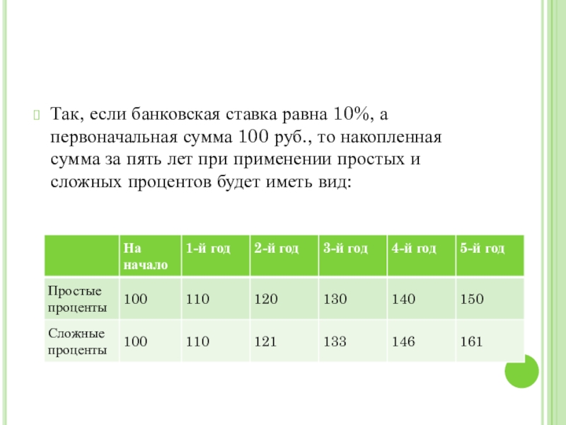 Слайд 5Так, если банковская ставка равна 10%, а первоначальная сумма 100 руб.,