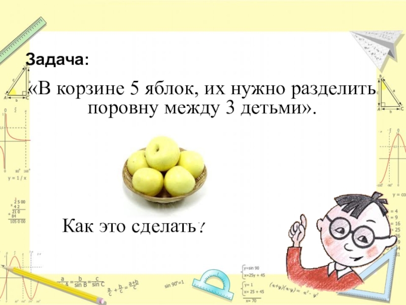 Задача:«В корзине 5 яблок, их нужно разделить поровну между 3 детьми». 		Как это сделать?