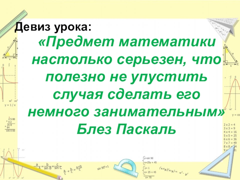 Девиз урока:  «Предмет математики настолько серьезен, что полезно не упустить случая сделать его немного занимательным» Блез