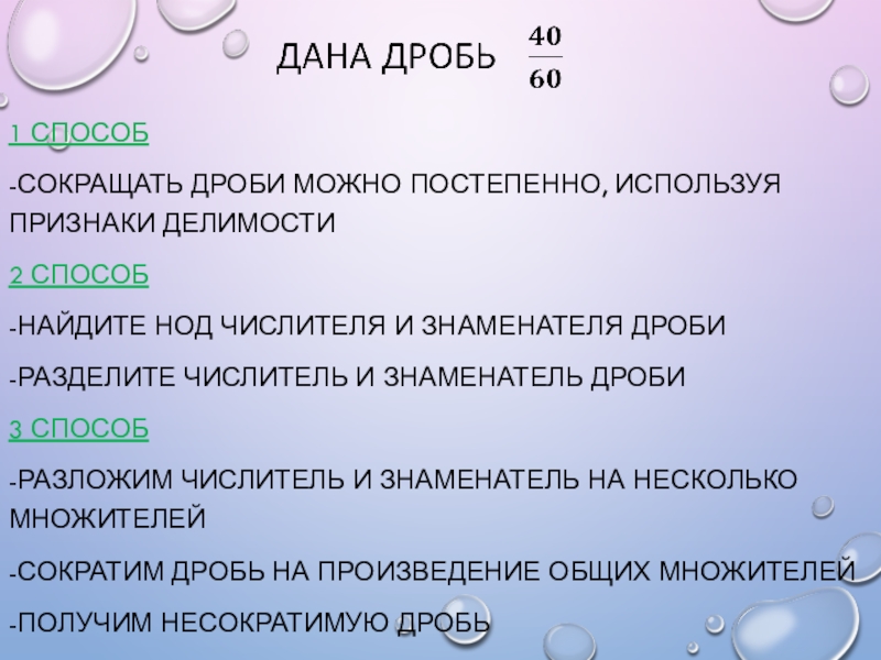 1 способ-Сокращать дроби можно постепенно, используя признаки делимости2 способ-найдите нод числителя и знаменателя дроби-разделите числитель и знаменатель