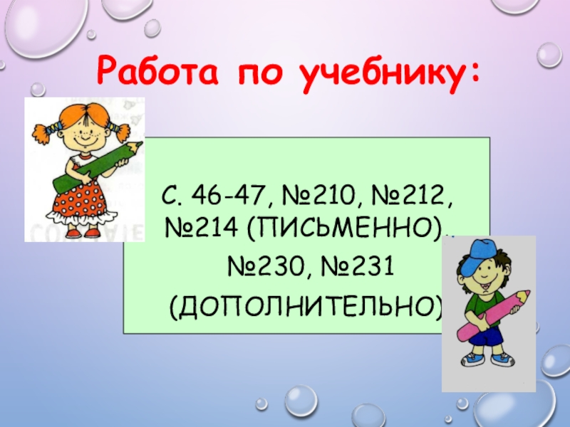 С. 46-47, №210, №212, №214 (письменно), №230, №231(дополнительно)Работа по учебнику:
