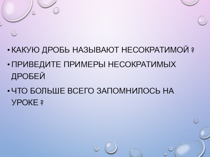 Какую дробь называют несократимой ?Приведите примеры несократимых дробейЧто больше всего запомнилось на уроке ?