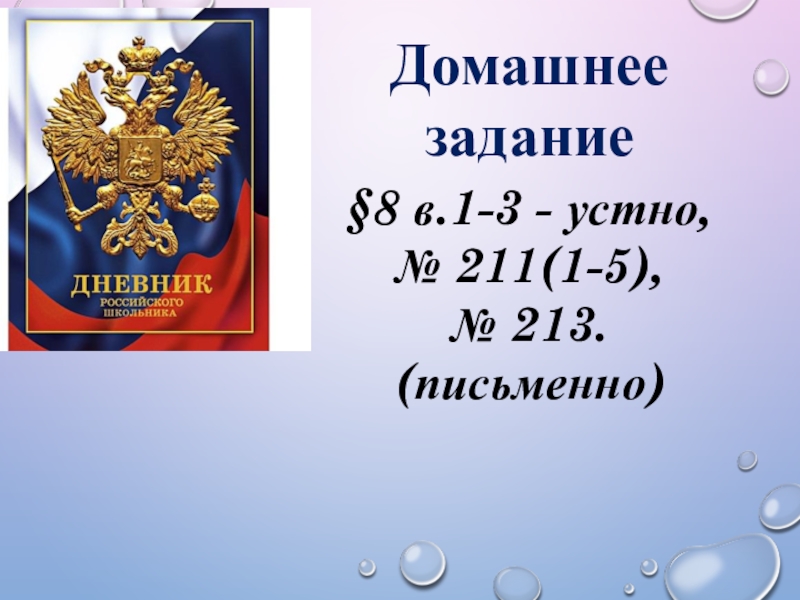 §8 в.1-3 - устно, № 211(1-5), № 213.(письменно) Домашнее задание