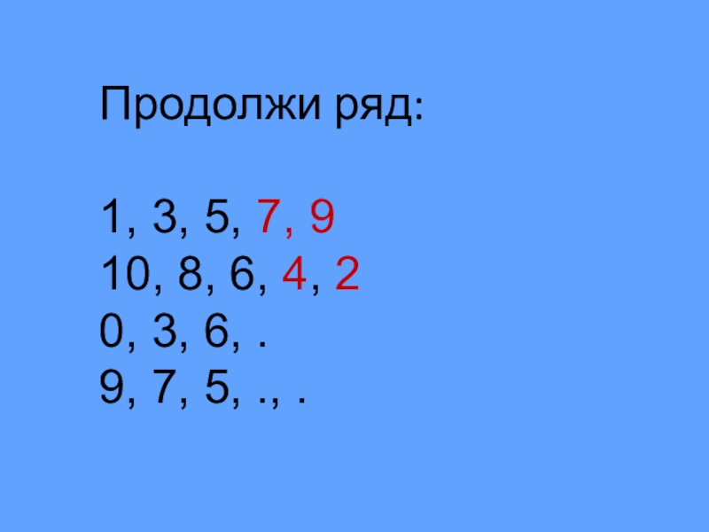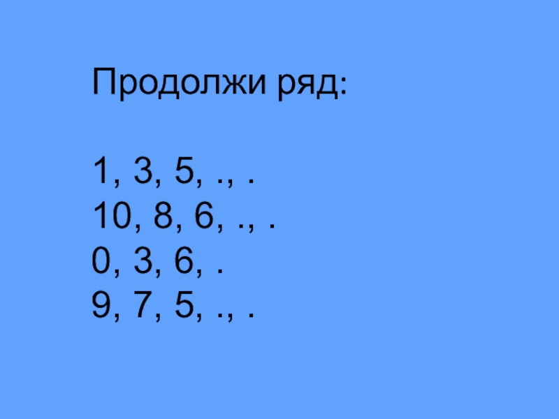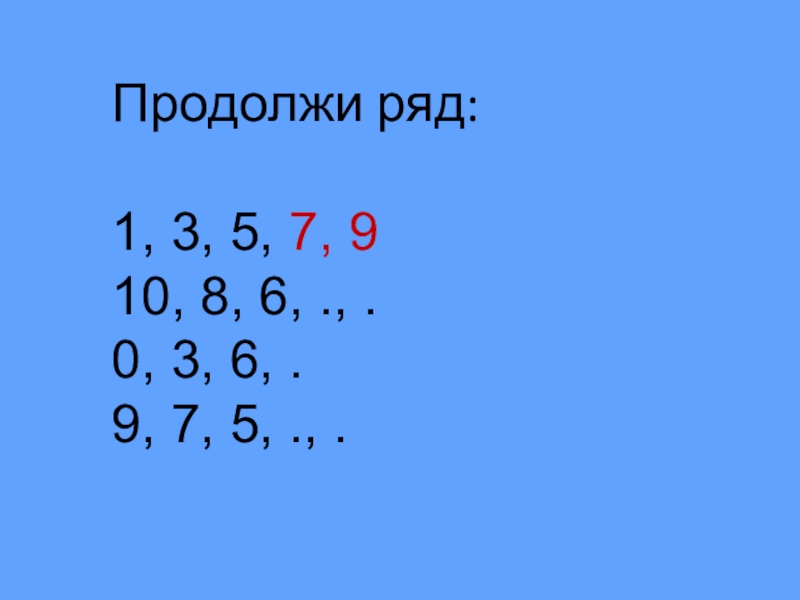 Продолжи ряд:1, 3, 5, ., .10, 8, 6, ., .0, 3, 6, .9, 7, 5, ., .