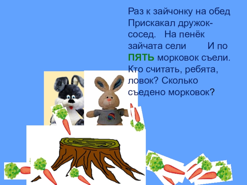 На пенёк зайчата сели И по ПЯТЬ морковок съели. Кто считать, ребята, ловок? Сколько съедено морковок?
