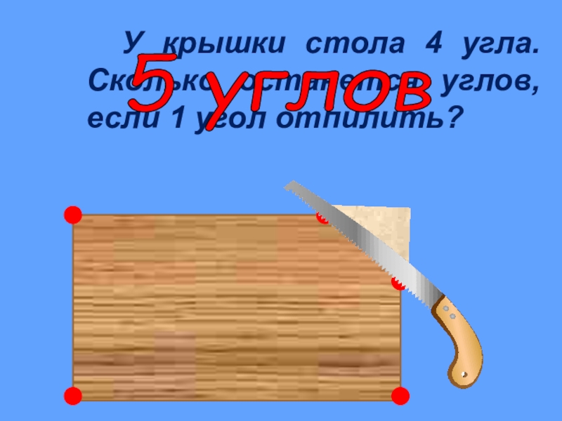 Слайд 5 У крышки стола 4 угла. Сколько останется углов, если 1 угол