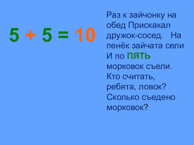 5 + 5 = 10Раз к зайчонку на обед Прискакал дружок-сосед.  На пенёк зайчата сели