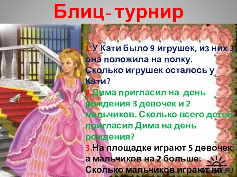 Блиц- турнир1.У Кати было 9 игрушек, из них 3 она положила на полку.Сколько игрушек осталось у Кати?2.Дима