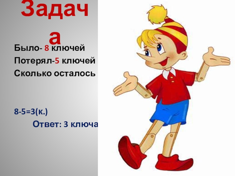 ЗадачаБыло- 8 ключейПотерял-5 ключейСколько осталось ?8-5=3(к.)     Ответ: 3 ключа