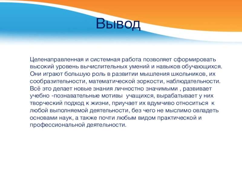 работа позволяет сформировать высокий уровень вычислительных умений и навыков обучающихся. Они играют большую роль в развитии мышления школьников, их сообразительности, математической зоркости, наблюдательности. Всё это делает новые знания личностно значимыми , развивает учебно -познавательные мотивы учащихся, вырабатывает у них творческий подход к жизни, приучает их вдумчиво относиться к любой выполняемой деятельности, без чего не мыслимо овладеть основами наук, а также почти любым видом практической и профессиональной деятельности.