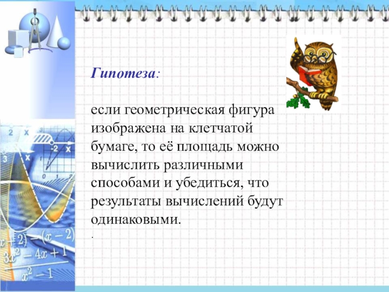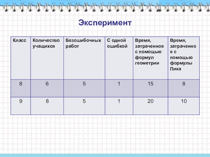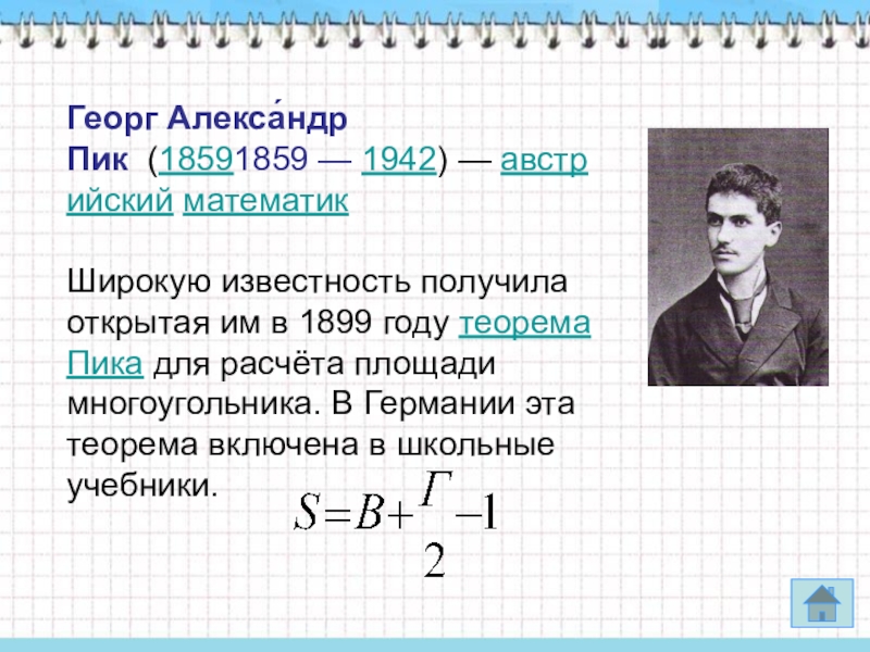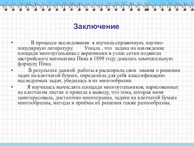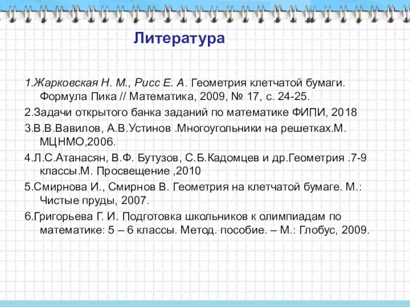 1.Жарковская Н. М., Рисс Е. А. Геометрия клетчатой бумаги. Формула Пика // Математика, 2009, № 17, с. 24-25.