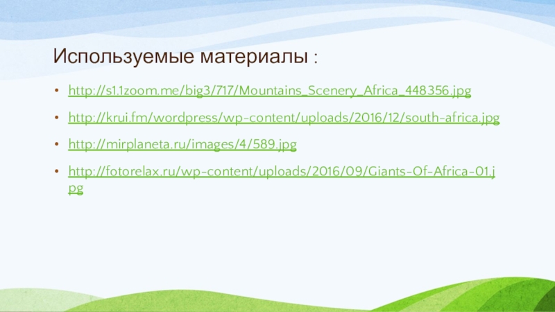Используемые материалы :http://s1.1zoom.me/big3/717/Mountains_Scenery_Africa_448356.jpghttp://krui.fm/wordpress/wp-content/uploads/2016/12/south-africa.jpghttp://mirplaneta.ru/images/4/589.jpghttp://fotorelax.ru/wp-content/uploads/2016/09/Giants-Of-Africa-01.jpg