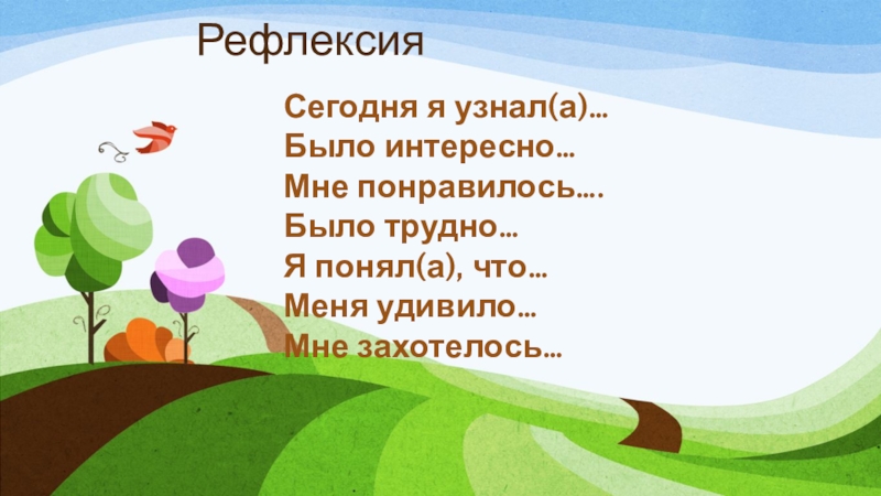 РефлексияСегодня я узнал(а)…Было интересно…Мне понравилось….Было трудно…Я понял(а), что…Меня удивило…Мне захотелось…